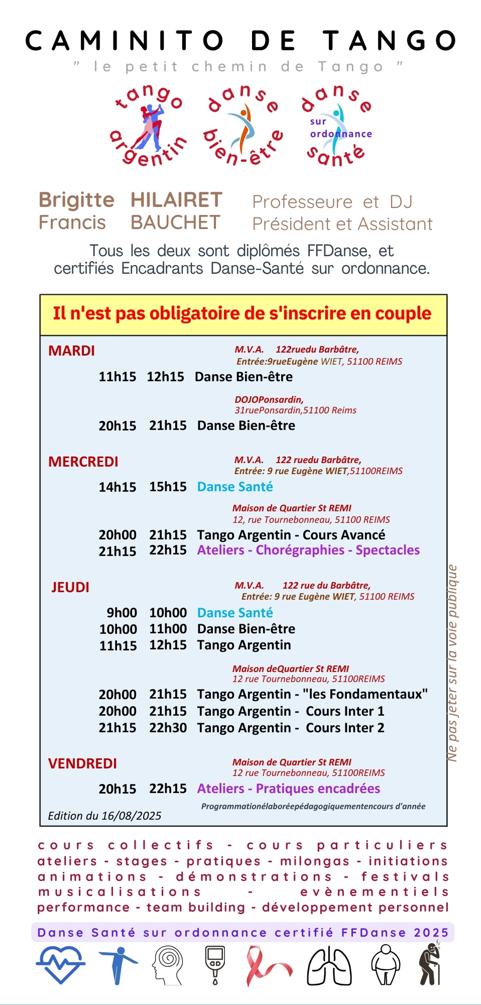 L'équipe de Caminito de Tango plus présente que jamais en cette nouvelle année, vous propose à Reims des cours de tango argentin collectifs hebdomadaires ou individuels, mais aussi des ateliers de Danse Bien-être, des pratiques dirigées de Tango Argentin et des Séances de DANSE-SANTÉ sur ordonnance.