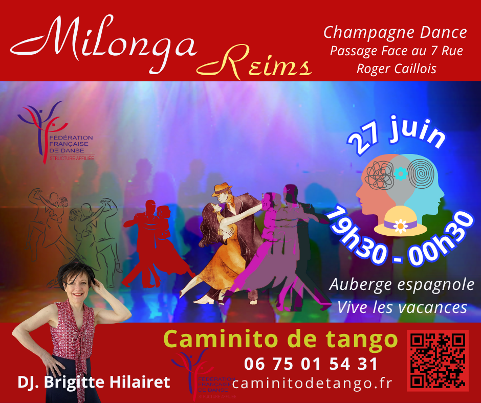 Le 27 juin 2025, Caminito de Tango organise une milonga au Champagne Dance Will , face au 7 rue Roger Caillois, 51100 Reims de 19h30 à 00h30 dans la grande salle climatisée.