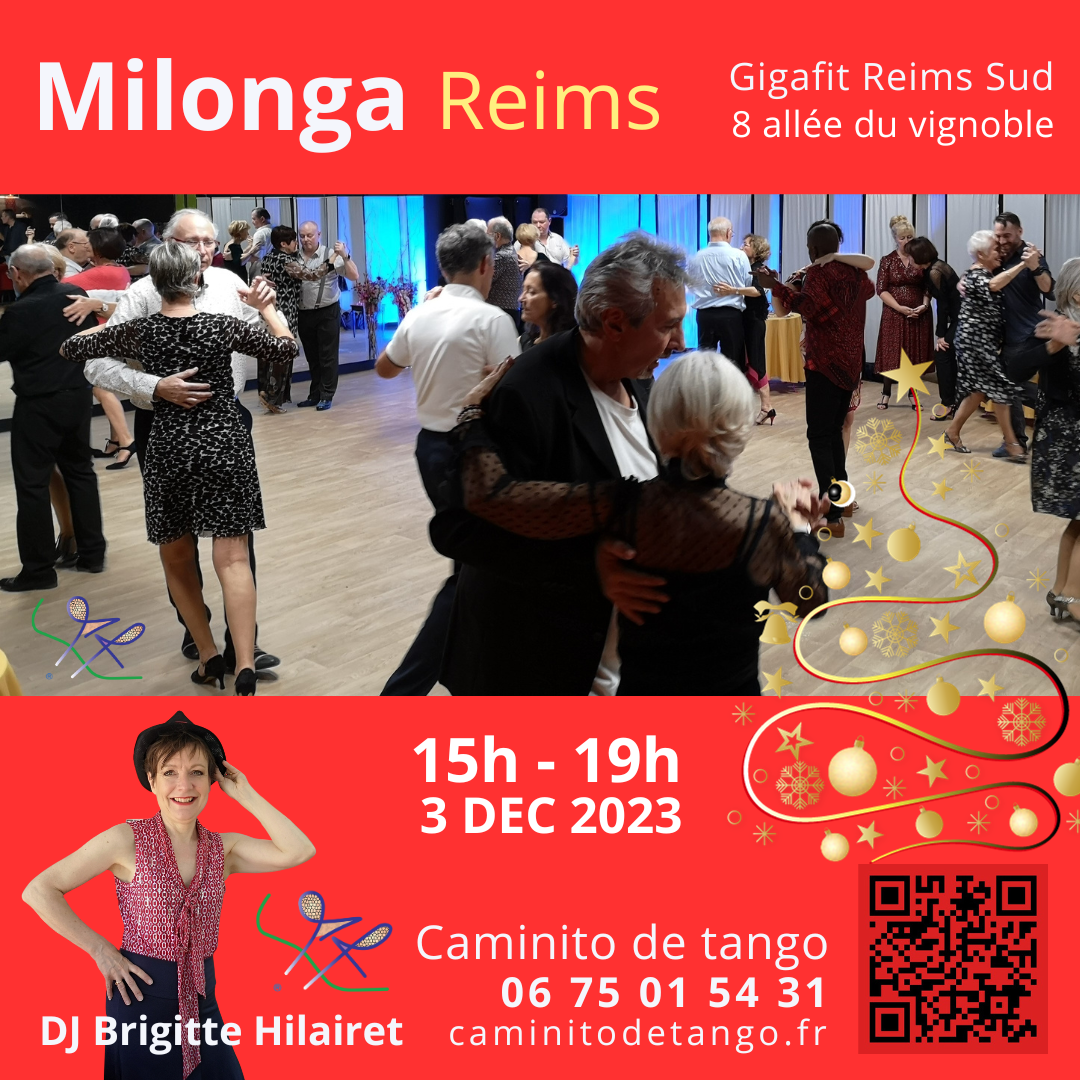 Superbe dernière milonga de 2023 au Gigafit Reims-Sud, 8 allée du Vignoble à Reims, de 15h à 19h. Belle ambiance amicale, beaucoup de monde, danse non-stop grâce à notre DJ Brigitte HILAIRET.
